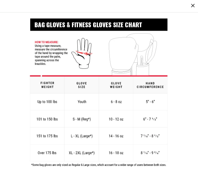 The Gloves are Titles Guts and Glory see the chart below for size.